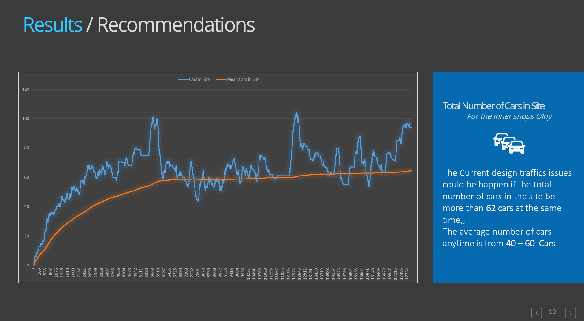 This simulation provides a data-driven approach to retail development by modeling the complex interaction between customer traffic and internal shop operations. Using AnyLogic, I developed a hybrid model that simulates agent-based driver behavior alongside discrete-event service processes. This allows developers to determine the exact saturation point of a site—identifying the maximum number of customers served and the optimum service time per shop. By testing different design layouts, we can pinpoint specific "enhancement points" that reduce wait times and maximize the commercial throughput of the entire mall.